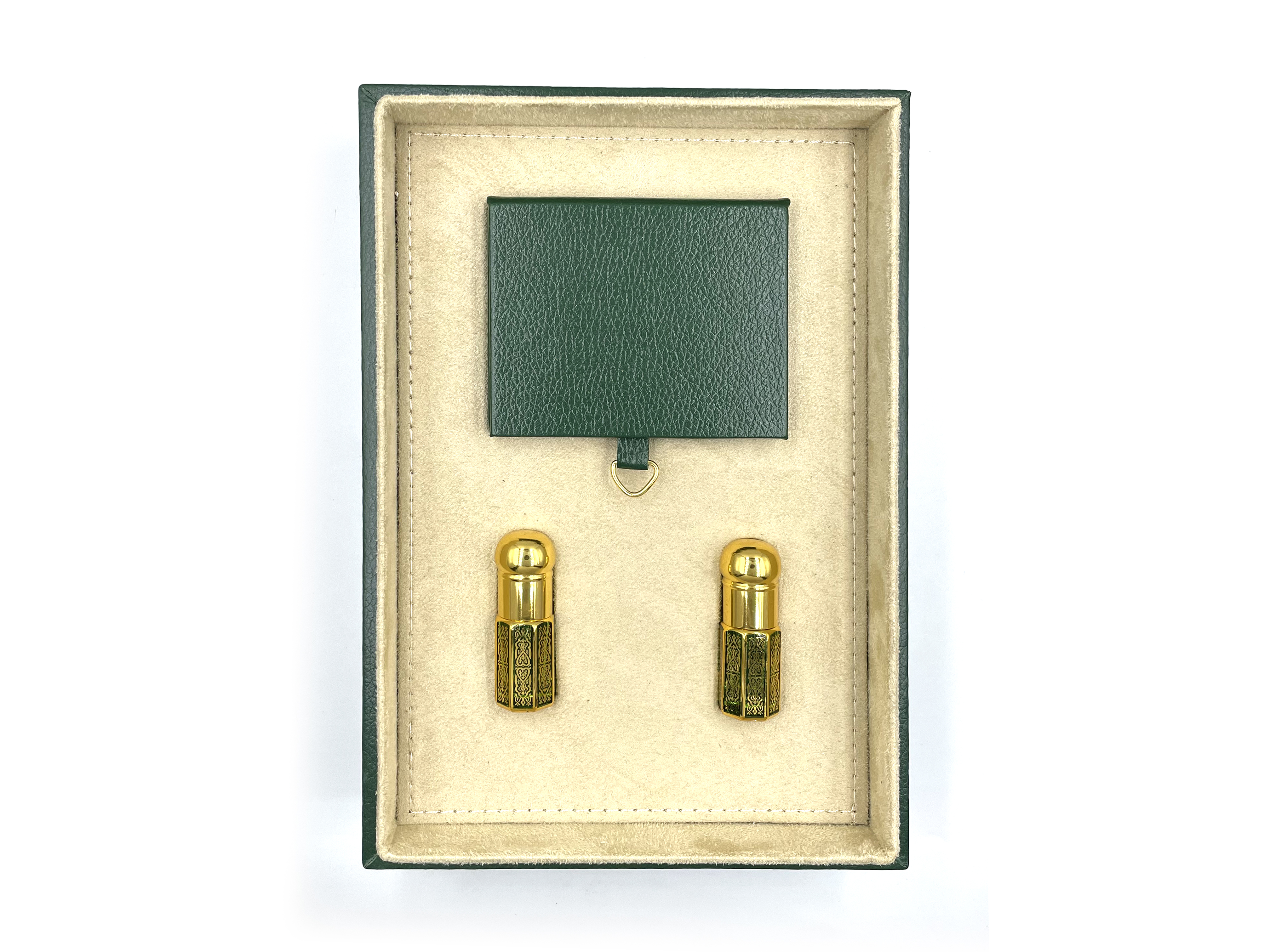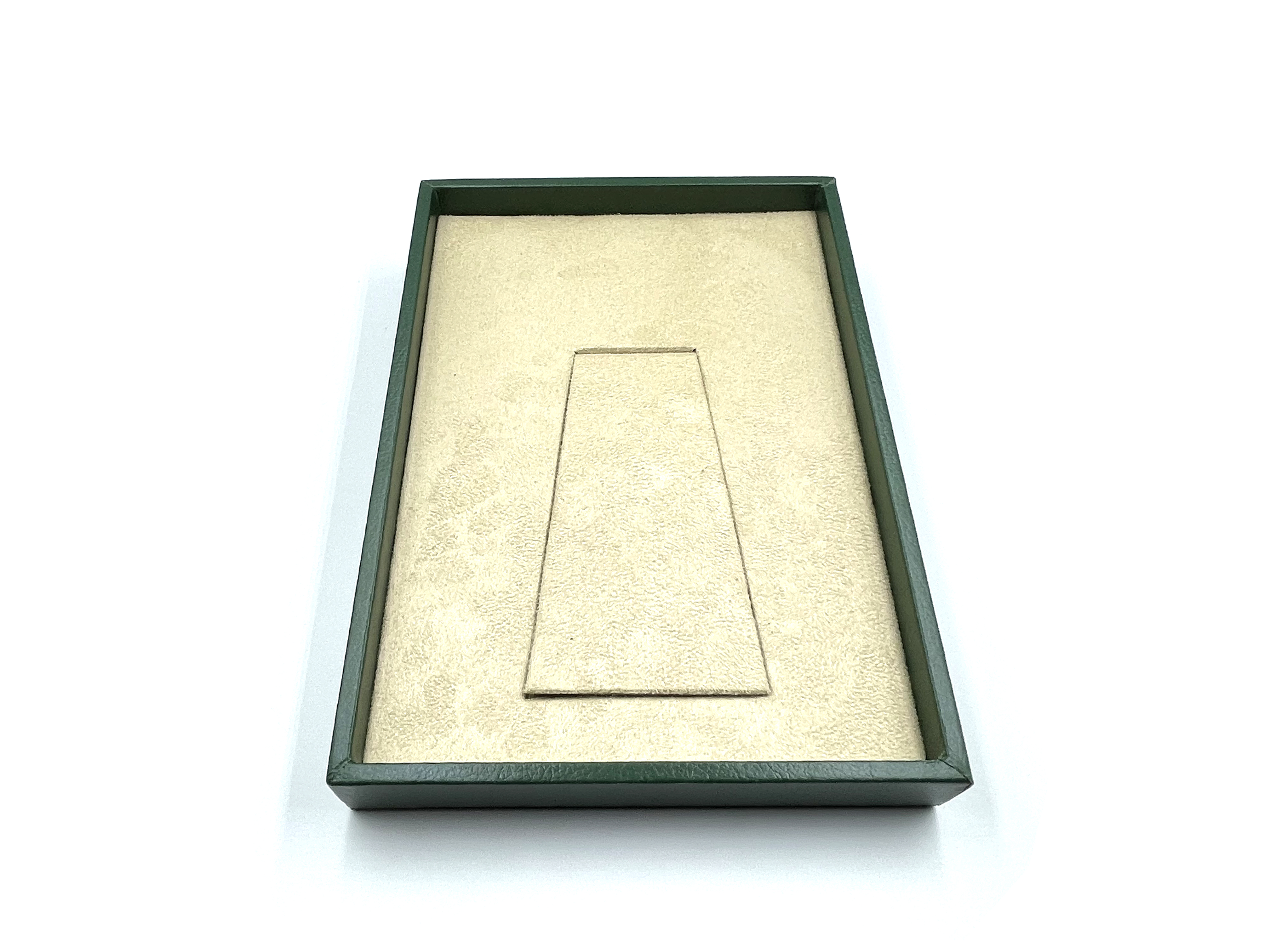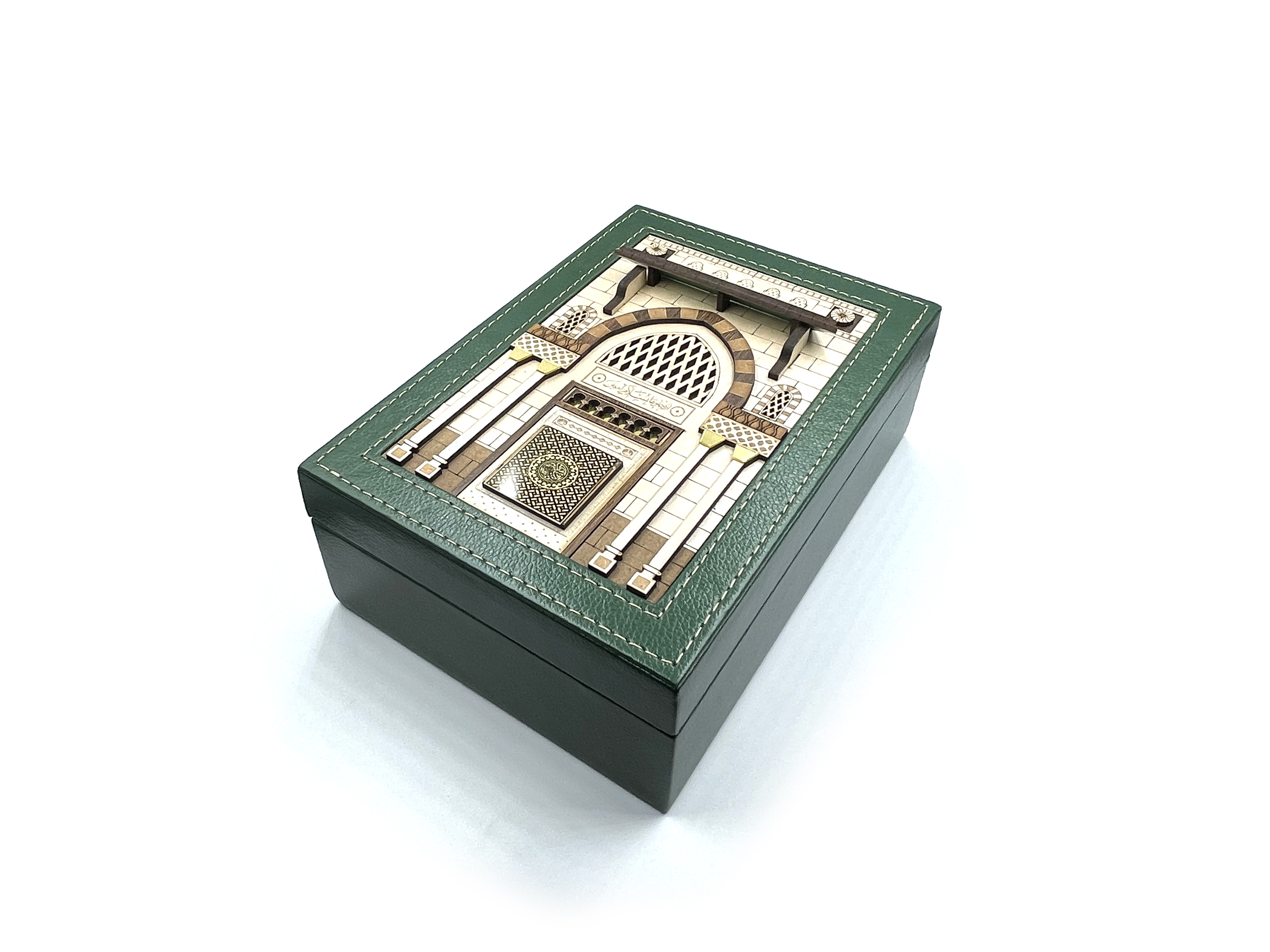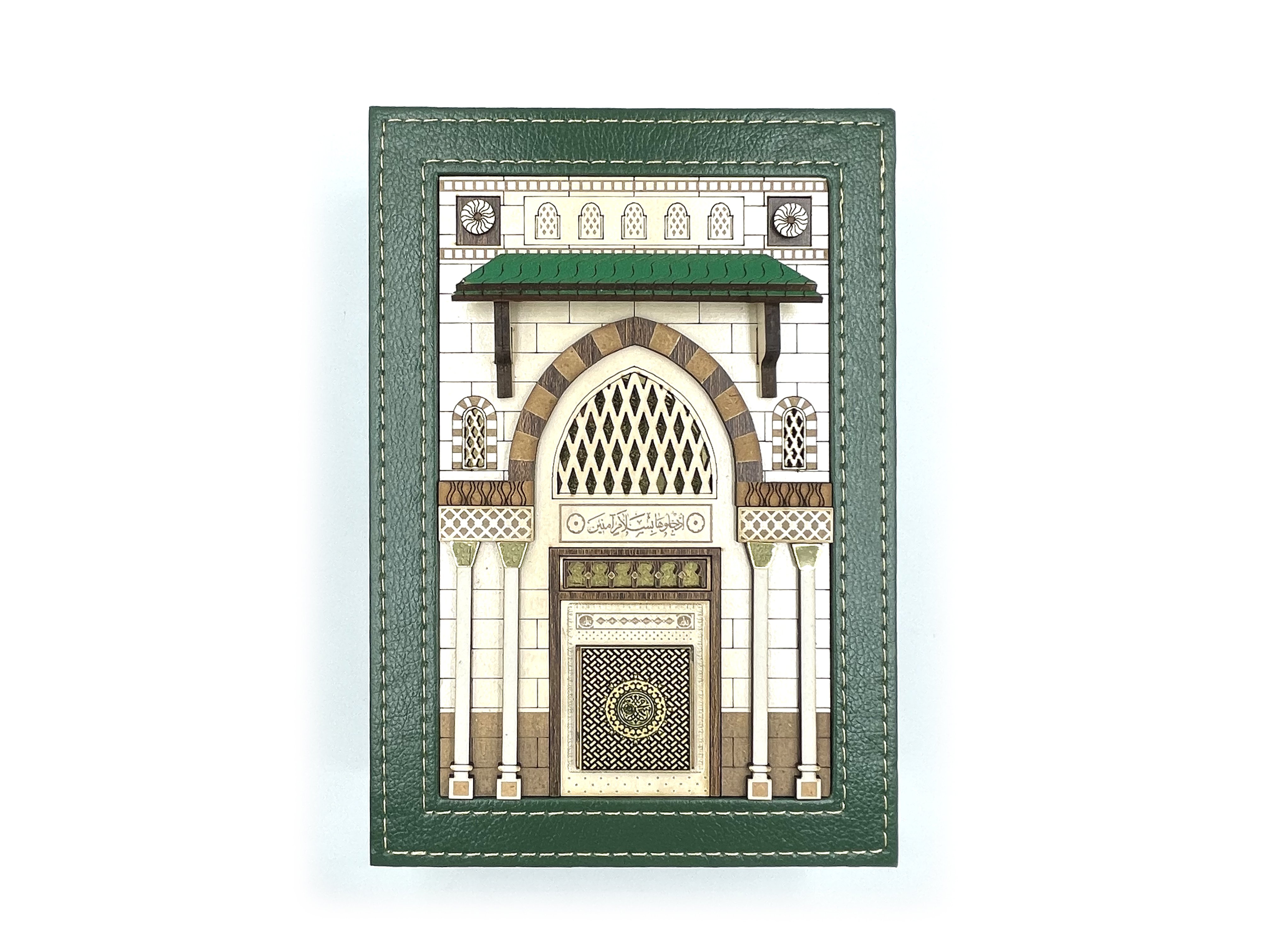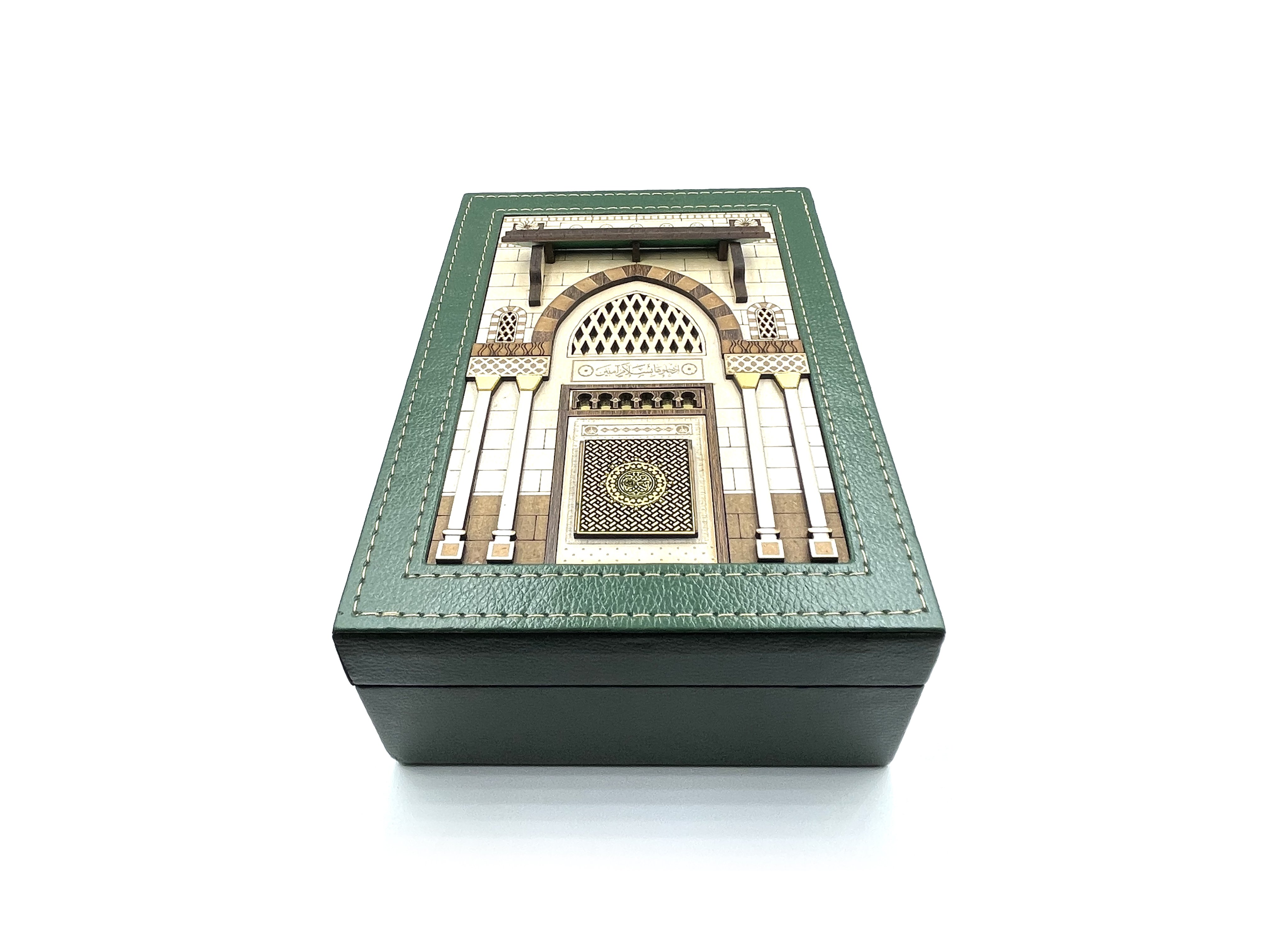 علبة جلد اخضر وبلون بيج من الداخل مع غطاء مفصول باستاند ثلاثي الابعاد لمدخل المسجد النبوي