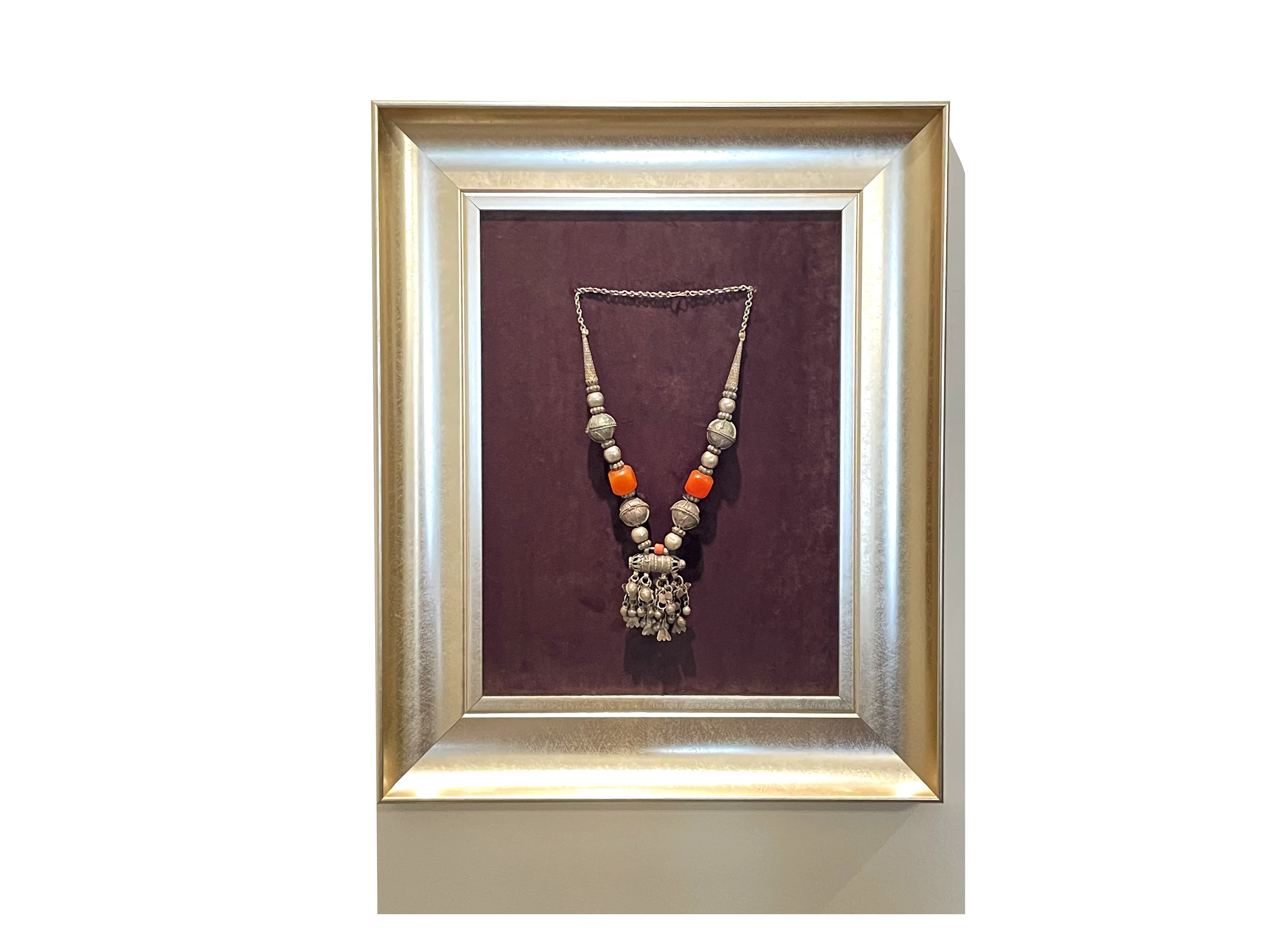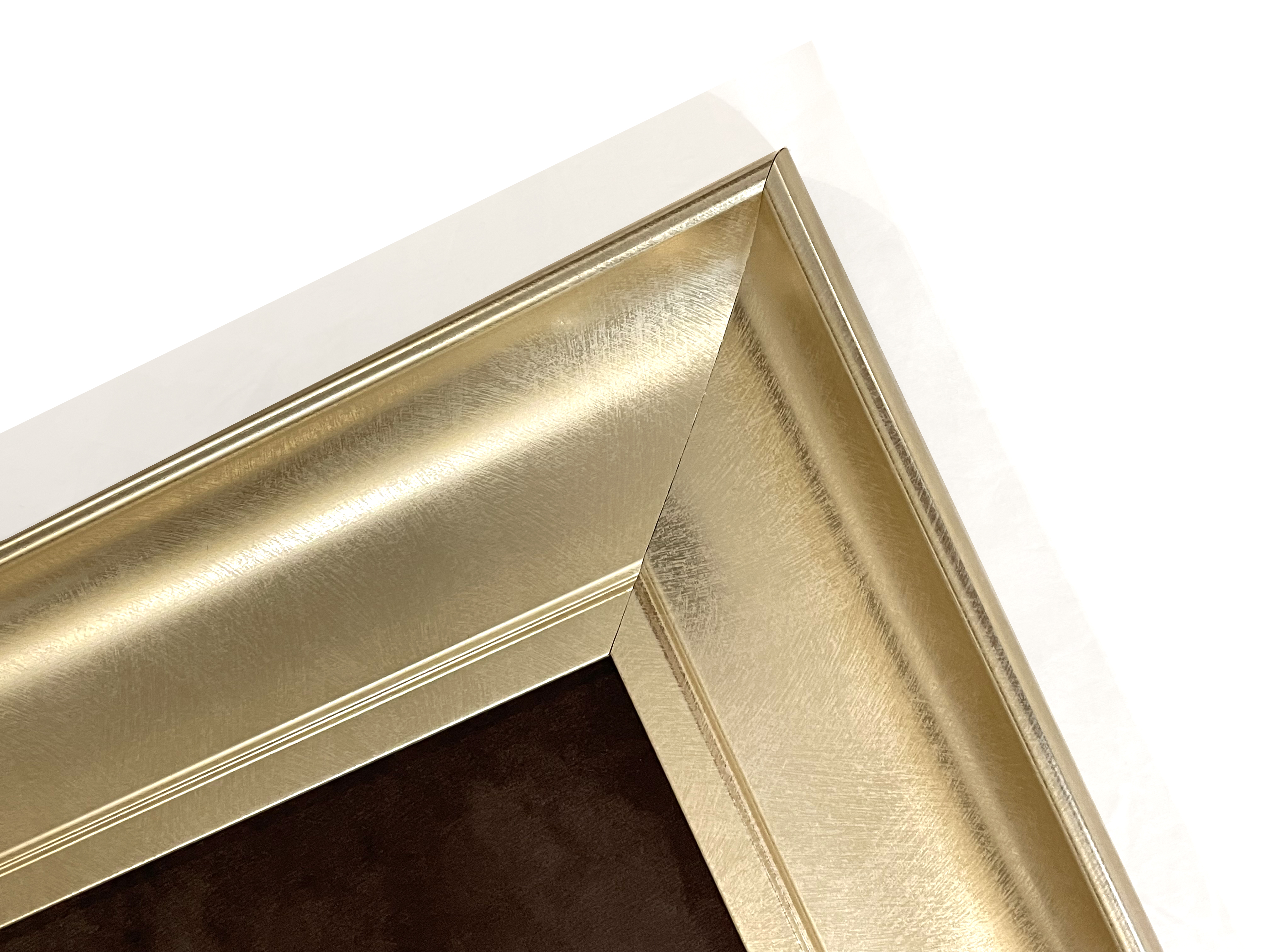 اطار فاخر بلون مخلوط بين الذهبي والفضي هير لاين مع ارضية مخمل بلون بني مع قاعدة خشب مضغوط للتدعيم وهوك تعليق مسمار