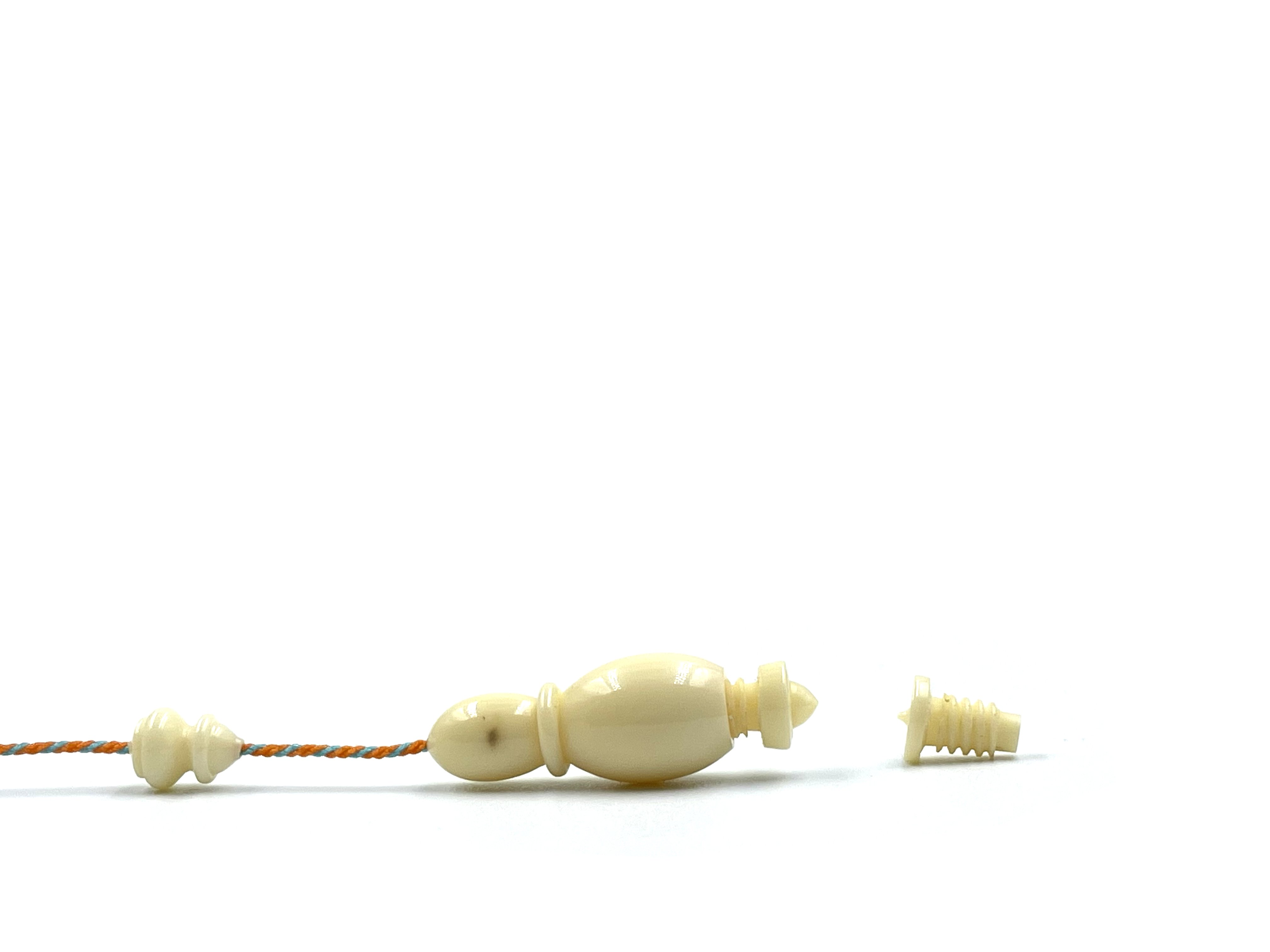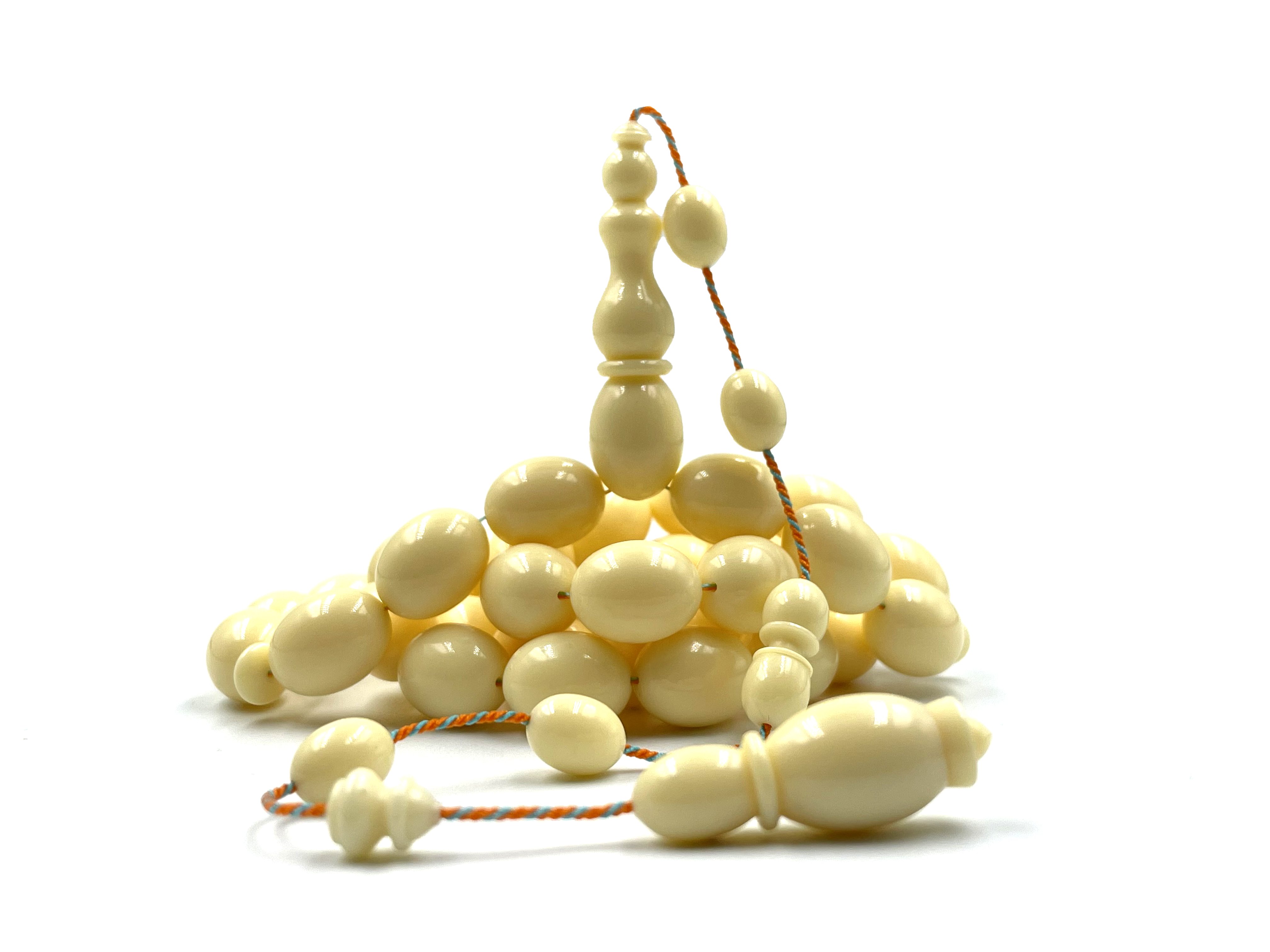 A rosary made of a mastic cube with a dark, antique cast wrapper